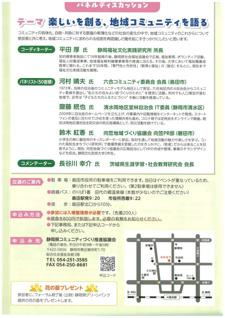また、当協議会推進専門委員 平田 厚 様(静岡福祉文化実践研究所 所長)をコーディネーターとし、「楽しいを創る、地域コミュニティを語る」をテーマにパネリストと共にディスカッションをしていただきます。