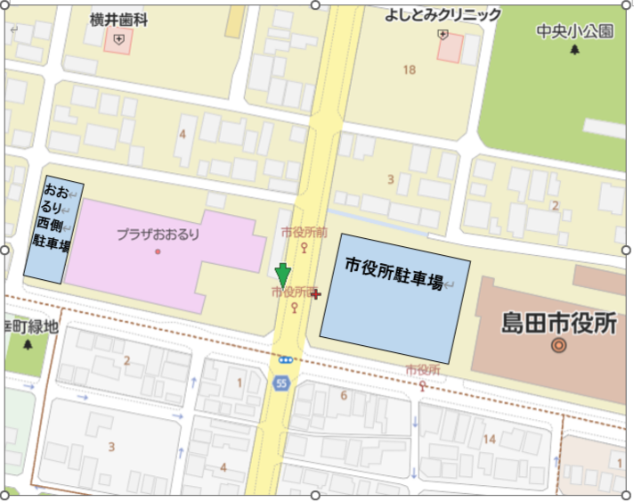 市役所駐車場とプラザおおるり西側駐車場をご利用いただけます。